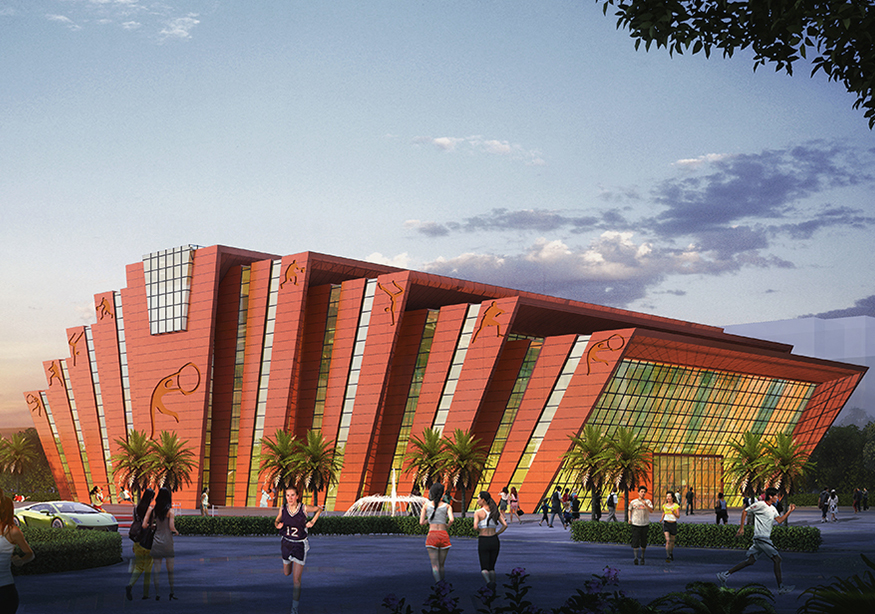 原學(xué)校顏色以灰白色為主要色調(diào),中學(xué)是一個年輕人集聚的場所是一群有朝氣,活潑的祖國未來的花朵。紅色代表著熱量、活力與意志力。因此體育館設(shè)計采用紅色作為主要色調(diào)。符合體育館的建筑性格。點綴整個校園,點燃學(xué)生的激情。